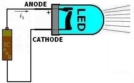 Esto significa que el acero lado positivo de la pila de 1,5 voltios conduce corriente hacia el ánodo del LED.