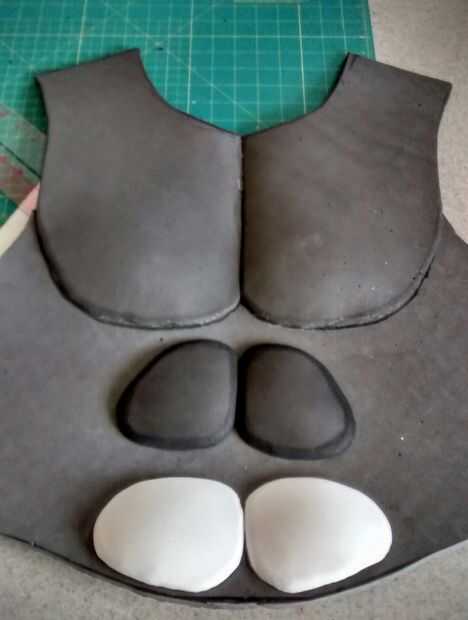 Usando las plantillas, transferir los diseños a la espuma. Asegúrese de voltear sus patrones para crear una imagen de espejo de las piezas por lo que no terminas con dos pectorales derecha. Para mi diseño deliberadamente corté los pectorales y los hombros separados de la parte principal para añadir más profundidad y detalle. Añadir una pulgada o tan al cuerpo principal para pegar las piezas a (ve arriba).