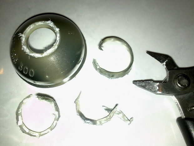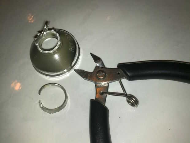 Corte la brida final que la bombilla va a través con un cortador. He intentado usar Dremel con disco de corte para el primero de ellos pero el resultado no fuera bien. El calor creado mientras lo era demasiado intenso que enturbiaron el acabado cromado del reflector. Está bien si no te importa que mate en lugar de cromo brillante. Utilizando cuchillas y papel de lija más tarde resultará en mejor acabado. Yo uso papel de 80grit a la arena plana y 200grit para hacerla más elegante y presentable.