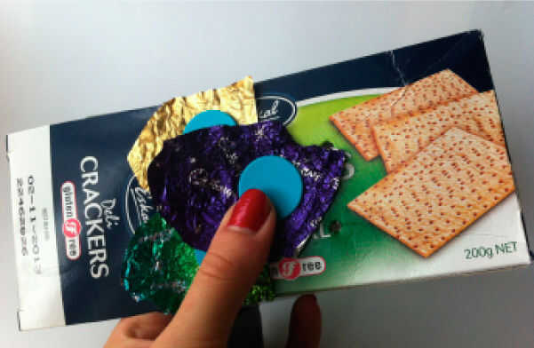 Cortar sus envolturas chocolate o papel colorido en redondo escala formas y fije con Makedo volver a clips. En marcha en la parte posterior y la capa hacia la parte delantera de los peces. Cubrir el pescado entero en las capas de escamas como se muestra en la imagen.