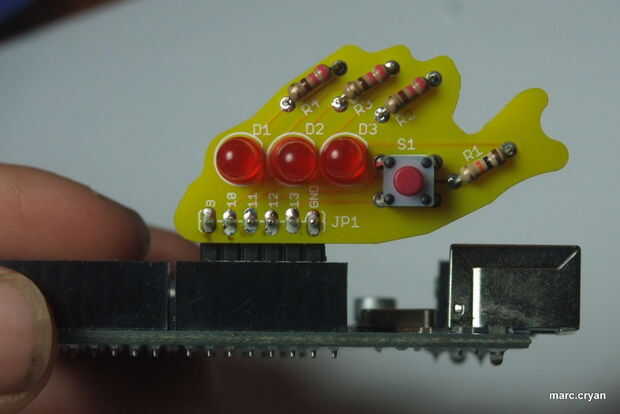 instrucciones de montaje de un tablero de Add-on para el Arduino.PARA OBTENER INSTRUCCIONES PARA MARZO DE 2013, PROYECTO DE KICKSTARTER IR AQUÍ************Tiene un LED y un botón.Conecta con los pines digitales 9-13 y la tierra.  Mi esperanza es que