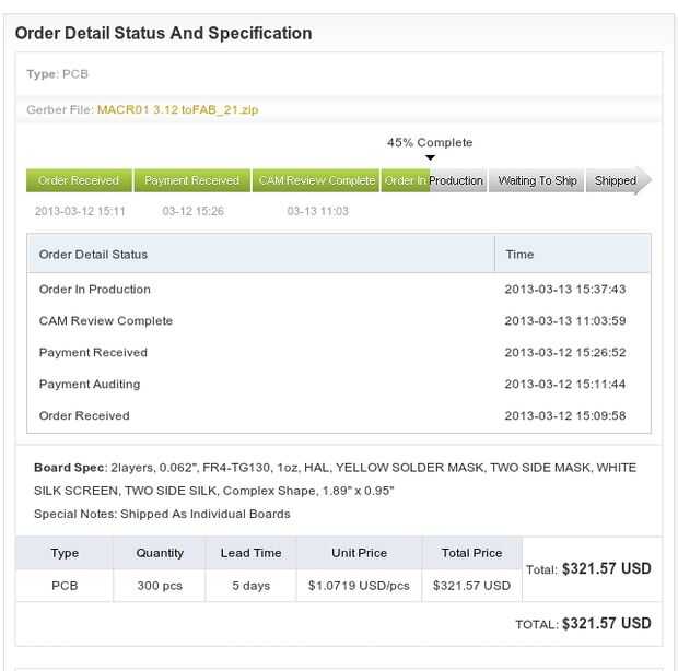 Aquí están los detalles de la orden de PCB.