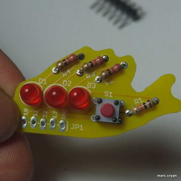 los espectáculos me armar el circuito en la página 43 de empezar con Arduino, por Massimo Banzi.Este ejemplo es un muy buen punto de partida al utilizar el sistema Arduino.  Es la base de mi proyecto Pez BlinkyAquí es cómo funciona:Código se carga en