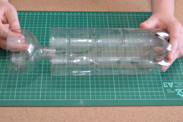 En primer lugar hay que preparar la botella retirando la etiqueta, tapa y anillo de plástico. Sería una buena idea de swill hacia fuera de la botella con agua para limpiar si no lo has hecho ya. Una vez que la botella está lista se puede proceder a cortar la parte superior. Envolver un trozo de papel alrededor de la botella conectada cinta adhesiva para darle a una guía cuando estoy cortando (ver video).