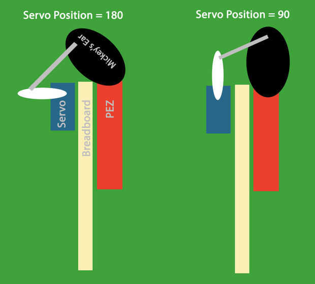 2) ahora girar el cuerno hasta que esté en la posición 90 aka arriba/cerrado (ver figura). Utilizando un alambre firme, doblar un extremo en un gancho e inserte en el horn del servo. Envuelva el otro extremo alrededor de la oreja de Mickey Mouse.