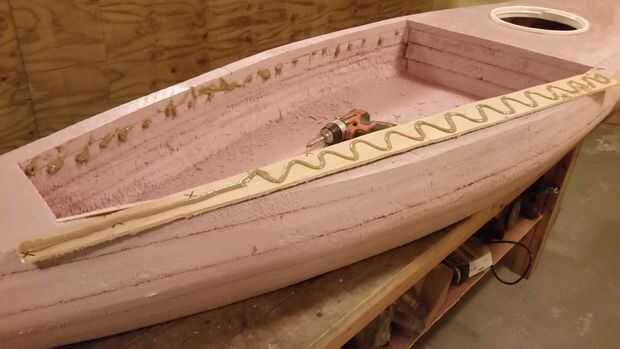 El barco flex cuando golpeando en las ondas, los rieles de madera en el borde de la bañera son necesarias para mantener el casco de doblar demasiado. Hice mis rieles de trozos de madera, hay una pausa en cada larguero aproximadamente un pie de la parte delantera de la cabina. La fuerza de la flexión del casco causó la piel tela rasgar justo a cada rotura en los rieles.