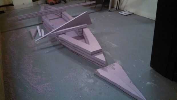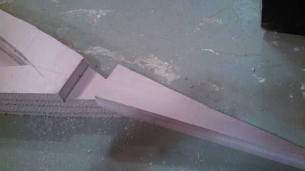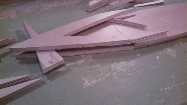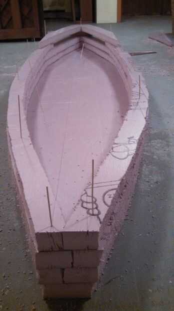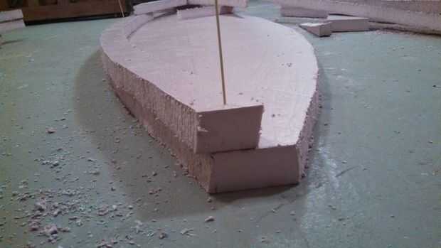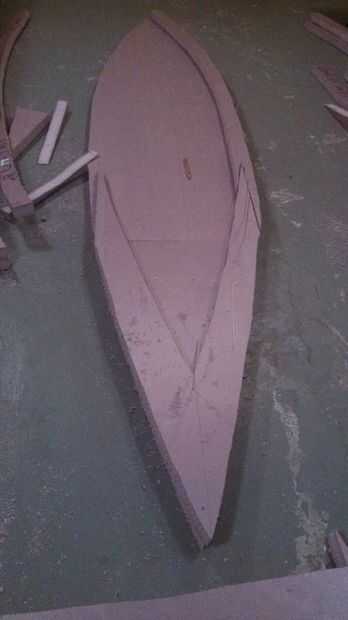 Ahora seleccione un arco V que es entero y usar secciones de espuma "residuos", espacio sobre la proa de la embarcación y la parte inferior de una costilla como se muestra en la imagen. desea que el punto del arco V traslape una media pulgada a la proa y pulgadas. (esto le dará el arco "rastrillo")