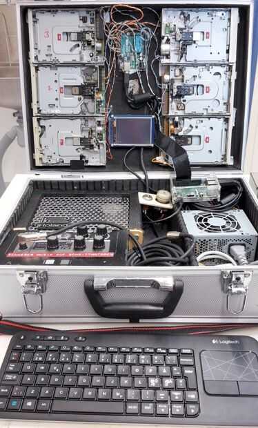 Leí el instructables de n1cod3mus y analógica-Chick e interés en la construcción de una configuración de disco musical de mi propia. Mi objetivo era crear una instalación móvil que podía ser fácilmente transferida y utilizada en sitio de forma independiente. Como pronto descubrió los motores paso a paso no están lo suficientemente alto, tuve que poner un amplificador en el caso también. Además, quería que el movimiento de los motores paso a paso a ser visible, es por eso que los discos se arreglan un poco diferentemente que encontré en los otros proyectos.