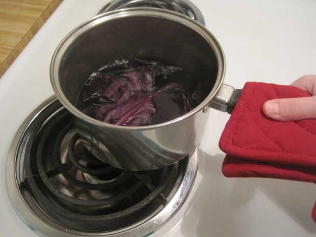 Tenga cuidado con el pan caliente y asegúrese de que el agua se enfría relativamente antes de pasar al siguiente paso (todavía puede ser caliente, pero no debe ser caliente). El agua en la cacerola debe aparecer ahora azul oscuro o púrpura, dependiendo del pH del agua (agua del grifo tiende a ser levemente básica, así que si usted utiliza agua del grifo, su solución puede ser azulada). Puede que no sea del mismo color como en las fotos que se muestra aquí; eso está bien. Las hojas también deben aparecer menos moradas, un color verde más azulado. Si no ha cambiado el color del agua, prueba hirviendo un poco más.