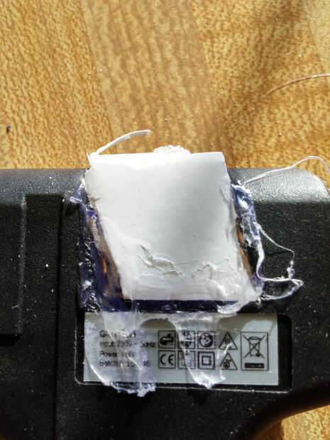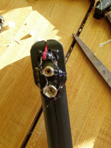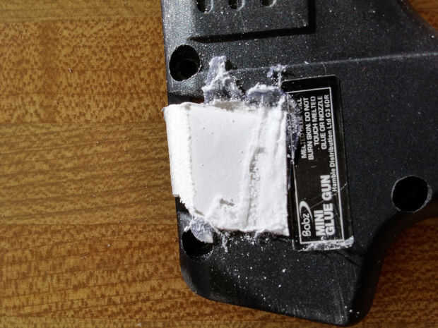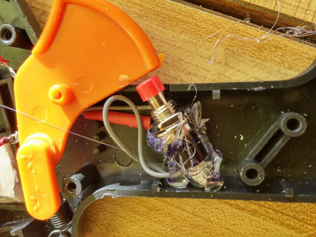 recorte de cartón pluma para tapar los agujeros. por lo menos debe ajustarse libremente. pegar con pegamento caliente. cortar un círculo de cartón pluma para caber el agujero en la parte delantera. también debe caber holgadamente. hacer un hueco en caben el láser. empujar el láser en el agujero y pegamento caliente al círculo. Coloque el círculo de cartón pluma en el orificio. pegue el botón para el arma que puede ser presionado con el gatillo. poner la caja de batería en la parte posterior.