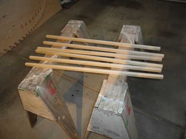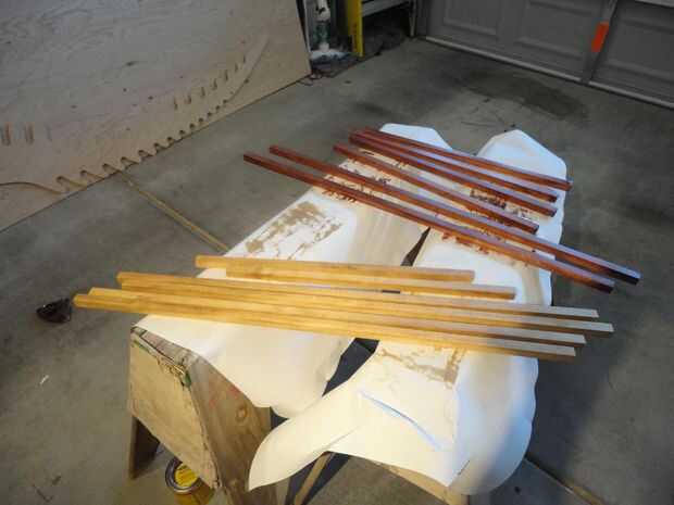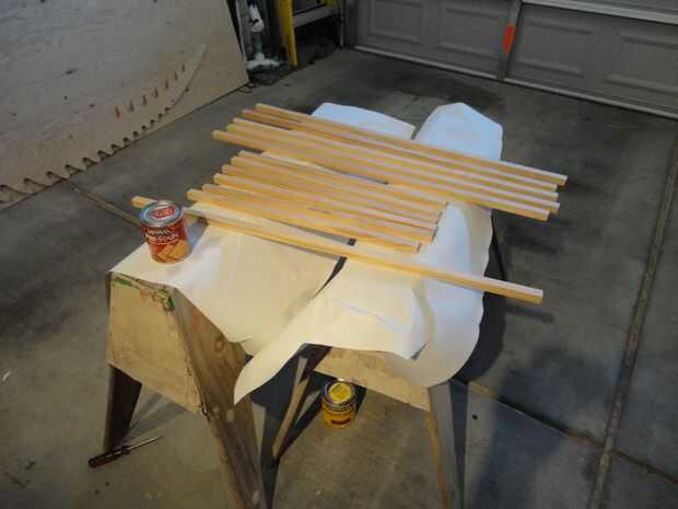 Todos los palos de arena completamente, incluyendo sus extremos. A continuación capa de cada uno de madera acondicionado, siguiendo las instrucciones del fabricante. Ya que estamos utilizando pino, el acondicionador es muy recomendable. Sin él, la madera será absorber la mancha irregularmente y se verá muy manchada. Por último, la mancha cada palillo por los planos adjuntos. (4 largo luz de colores, luz corta 2 colores, 3 largas y oscuras de colores, 4 color oscuro corto.)
