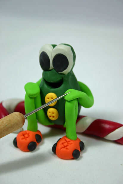 los puestos de perros calientes y helado se hicieron (junto con sus clientes) para ayudar a poblar Froggy mundo, el parque de diversiones aventura ranas.Las ranas fueron hechas usando arcilla Sculpey III Oven-Bake y luego al horno. El "brillo" v