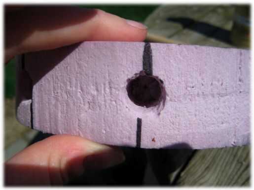6. 6. Vez que haya cubierto la forma círculo con cinta adhesiva, fijar una varilla de 6" espiga en cada orificio. Permanecen en mejor si pones un pequeño poco de pegamento en el agujero. Pegamento caliente funciona mejor. Aerosol pintado mis tacos para que la pHloat era todo un color y se podía ver fácilmente en la oscuridad. Pintura a pistola no es necesaria.
