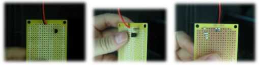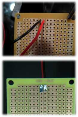 12. en primer lugar de la soldadura un cable negro (para tierra) y un cable rojo (para energía) como se muestra. Use el alambre de 22 calibre trenzado para todos