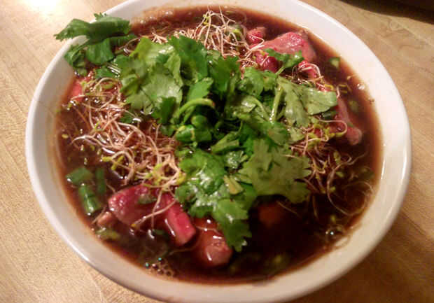 Usando un recipiente bastante grande para servir, agregar los tallarines y el solomillo en rodajas en la parte superior. Vierta el caldo sobre la carne a cocinar. Agregar cilantro y brotes de cebollino y exprimir unas rodajas de limón sobre su tazón para terminar.