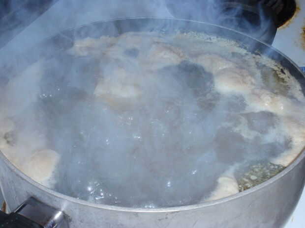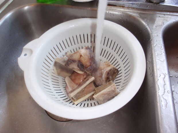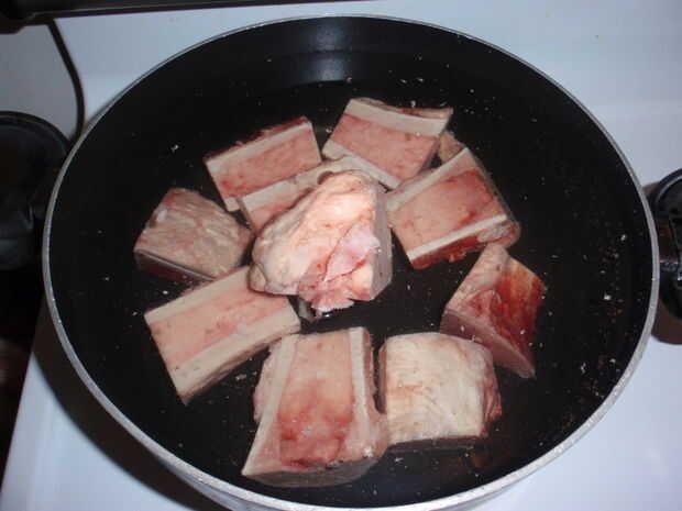 Si los huesos se cortan por la mitad longitudinalmente, sólo hervir por 5 minutos o se perderá la médula