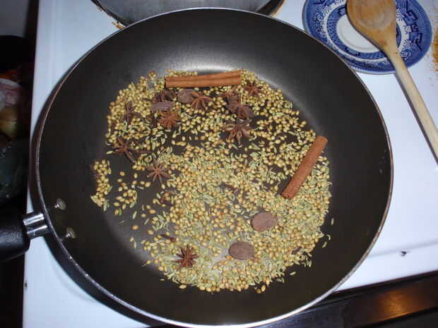 - Vainas de cardamomo, laurel, clavo, canela, semilla de hinojo, semilla de cilantro, granos de pimienta negras, anís de la estrella