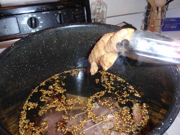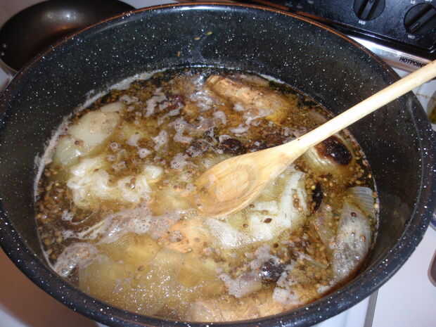 - Poner la carne encima de esta (esto ayudará a evitar que se quema si un lado queda tocando el fondo de la olla.)