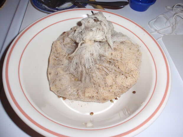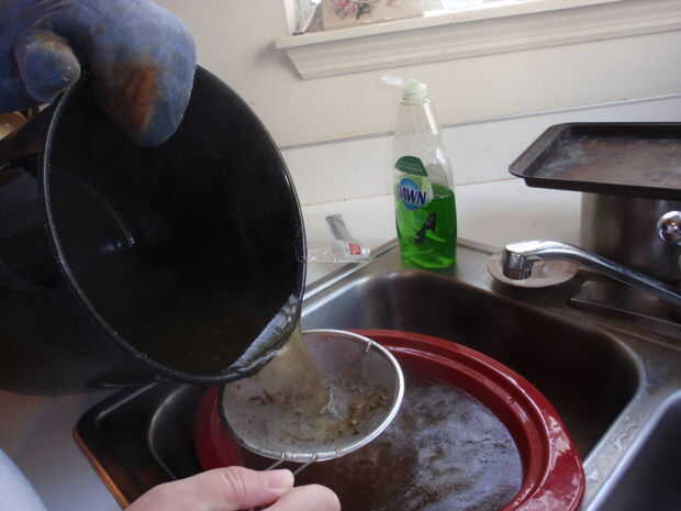 - Para colar el restante, vierta cuidadosamente el contenido de la olla por un colador en un recipiente grande para sujetar temporalmente. Esto es mucho más fácil con dos personas.