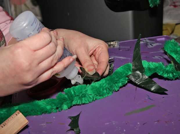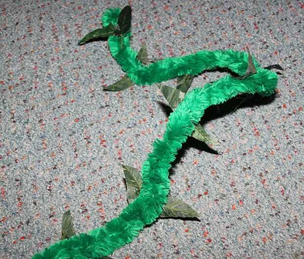 Que necesitábamos hacer la planta parece se extendía por todas partes con un montón de zarcillos arrastrándose fuera de la misma en todas partes. Hicimos los zarcillos de los vástagos del chenille verde de jumbo. Estos podrían doblados y en forma de brazos y de las vides ondulados. Cortar hojas artificiales en forma de pinchos y había pegado a lo largo de los tallos de chenilla para un aspecto espinoso. También hemos añadido hojas grandes como la mano de la planta. Para hacer estos, nos corte fieltro en forma de hoja verde. Intercala entonces pares de formas en alambre grueso, que estaba doblado en la forma y pegamento asesinado en lugar. Decoramos las hojas con brillo verde, basándose en las venas y líneas.
