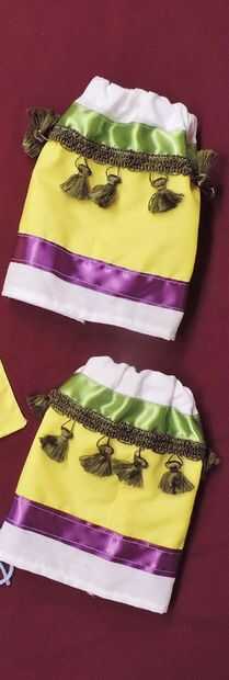 Los cascos fueron hechos de denim negro. Se hicieron con un agujero en la parte inferior, para permitir que los perros a caminar cómodamente. Correas elásticas fueron cosidas en alrededor de la parte posterior, para mantener en su lugar. Las decoraciones de tobillo se hicieron de tela blanco, con elástico cosido en la parte superior, para mantenerlos en su lugar, con un fondo abierto. Fueron adornados con cintas de diferentes colores y borla de adorno.