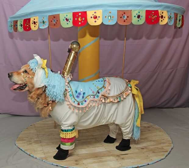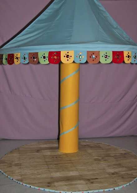 Hemos querido crear una escena de tipo carrusel real para los caballos estar de pie, por lo que se vería como un verdadero carrusel. Un toldo para una sala para niños fue utilizado para la parte superior del carrusel. Estaba decorado con joyas. El poste de centro estaba hecho de cartulina, que fue cubierto con fieltro amarillo y pegado en forma de tubo. Luego fue decorado con cinta azul va alrededor de él. El piso del carrusel estaba hecho de cartón pluma. Tres capas de seis hojas fueron pegadas y cortadas en forma de círculo. El círculo entonces fue cubierto con papel de regalo en madera. Los bordes estaban cubiertos con fieltro azul y joyas estaban pegadas todo alrededor de él.