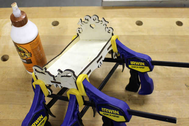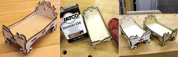 Después de cortar las piezas que se quitaron el material parental, los bordes y aberturas se limpiaron de las rebabas y residuos, y las caras se lija suave. Toques de pegamento de madera se aplicaban a las superficies de conexión y después fue montar la cama. Con pinzas el marco se deja para secar.