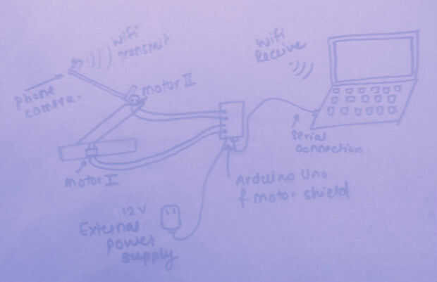 Phone'O'Dummy tiene dos motores para moverse en x y eje y. Es controlada por el microcontrolador de arduino y escudo del motor. Cámara del teléfono se utiliza para capturar el vídeo y se procesa en OpenCV utilizando Visual Studio 2010(VC++). Usando OpenCV detectamos la cara y cuando el usuario mueve que enviamos la señal a la placa arduino con serial connection(USB). Entonces la placa arduino mueve los motores por consiguiente.