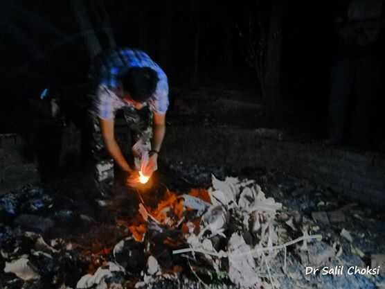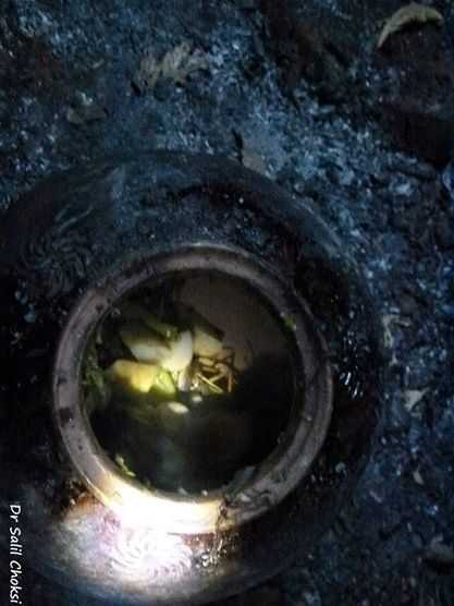 Cubrir la olla con un montón de hojarasca y ponerlo en el fuego durante 15-20 minutos, deje que la olla se enfría por 15 minutos.