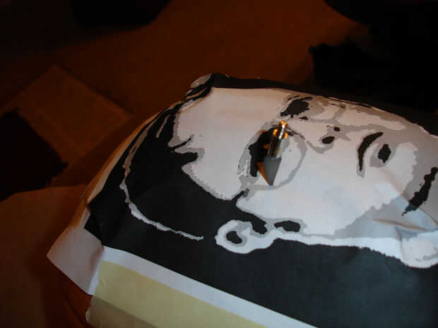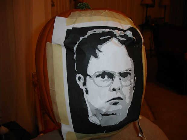 Una vez que se graba hacia abajo, es hora de empezar a trazar el patrón. Usando un cuchillo o palillo de dientes, poke agujeros a través del papel a la superficie de la calabaza. Los agujeros de más cercanos, más fácil será para quedarse en el camino de corte derecho más adelante. Trace el gris y los contornos negros.