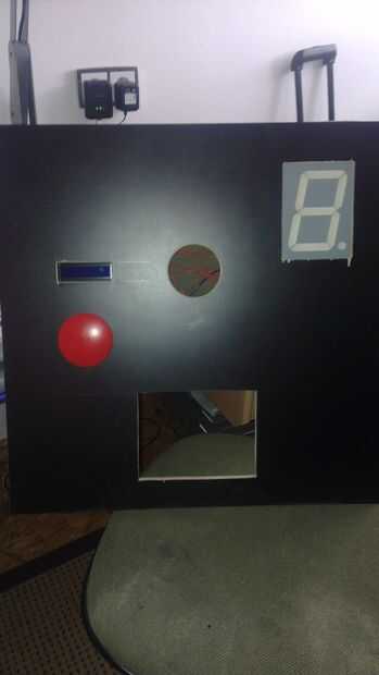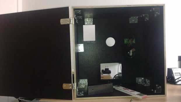 Compramos algunas tablas de madera (ir a su tienda local y pedirles si es posible hacer ya en el tamaño correcto) y se atornilla con la ayuda de los soportes de montaje. Asegúrese de no utilizar para tornillos grandes. Monte las bisagras en la parte trasera, así como una puerta se cierra. Ahora tienes que cortar los agujeros en la parte frontal de su caja. Un agujero circular centrada en pequeño para su lente, el más grande para su tablet, para su pantalla de ocho segmentos, uno para la pequeña pantalla de lcd y uno para el botón rojo. Atornille el vidrio acrílico delante del orificio de la tableta para proteger la pantalla.