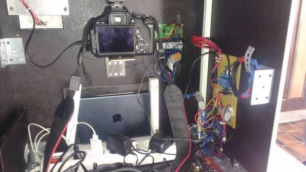 Hemos utilizado piezas de plástico para sostener la tableta en su lugar. Para montar la cámara, perforar orificios en un ángulo de metal (para poder agregar y quitar nuestra cámara con un tornillo) y atornillar este ángulo en el interior de nuestra caja (Asegúrese de que encaja en el agujero para el lente). Para su DSLR en el ángulo del tornillo necesita un tornillo de tamaño especial, compra en línea es la forma más fácil porque usted no la consigo por todas partes.