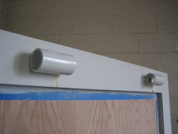 El accesorio de la cortina fue un poco difícil para mí entender. Ya había construido el cuerpo de photobooth y planeó sobre el uso de bisagras de cierre que se fijan a la parte superior de la cabina y a un anillo de tubo de metal (que celebró la cortina) no funcionaba las bisagras. Así istead perforé dos agujeros y consiguió dos juntas "T" PVC. Tengo tubo de PVC, una talla abajo de las piezas "T" y que encajen a través. Después sólo perforar otro agujero pequeño en el lado opuesto de la entrada y utiliza una clavija de madera para apuntalar la cortina. Este modo, cuando he tenido que mover el photobooth, sólo pude tomar hacia fuera de la espiga y la cortina se derrumbaría.