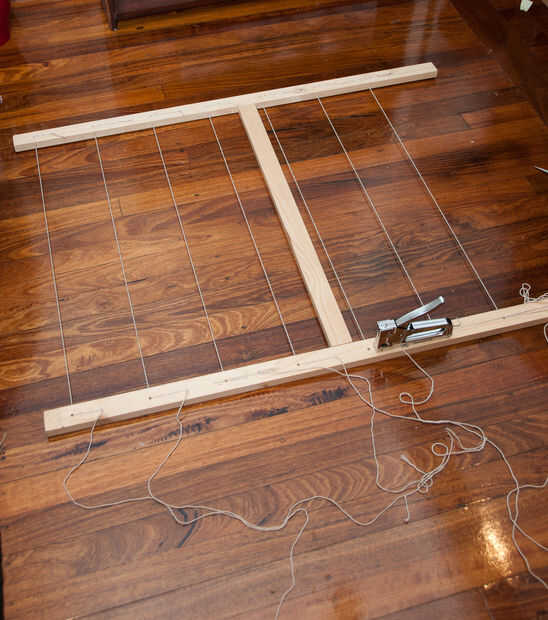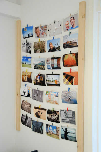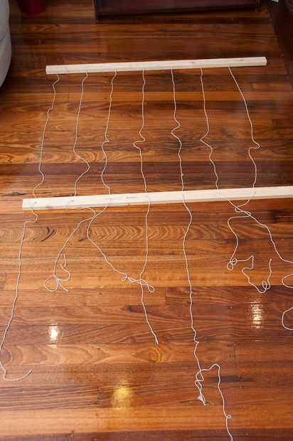 Utilice 2 juegos de los soportes de imagen de 3M en la parte posterior de cada lado para conectar todo a la pared. Asegúrese de que su línea esté a nivel y no demasiado apretado. La cadena utilicé cedió en pocos días, pero no creo que se ve mal. Tal vez usando el cable de imagen minimizar este efecto.