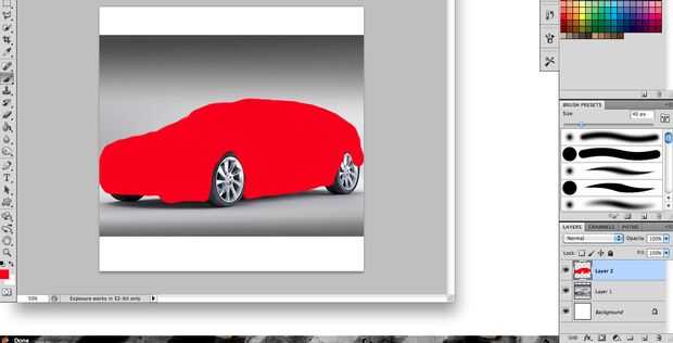 Ahora usted puede comenzar a pintar sobre el coche con cualquier color que desee. Elegí el rojo porque es muy visible. El color no importa porque vamos a usar magia Photoshop en los pasos siguientes. Aviso que sólo cambié la opacidad después el contorno general del coche. No importa cuando se cambia la opacidad. Una vez que ha cubierto totalmente el coche en una capa de pintura roja, es el momento de afinar el trabajo de pintura con la herramienta Borrar (E)
