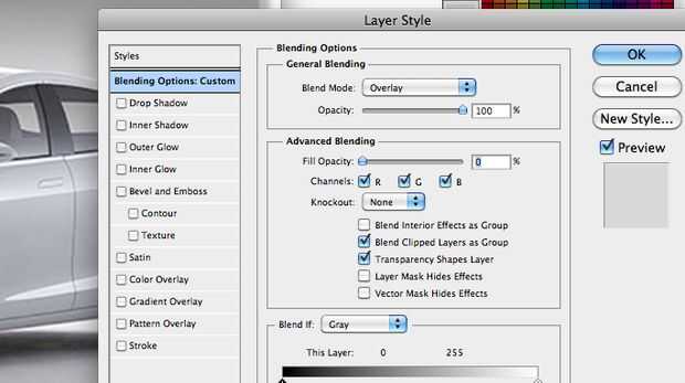 Una vez que haces uno de estos pasos, aparecerá el menú que se muestra en el cuadro 2. Parece un poco confuso al principio, pero realmente tienes que ver es el "modo de mezcla" y su slider de la opacidad y la "opacidad de llenar" justo debajo de él en la parte avanzada de mezcla.