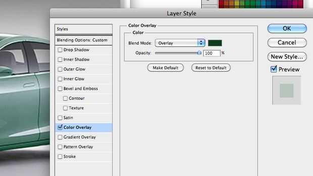 -Punta- Usted necesitará seleccionar un color más oscuro lo que puede esperar debido a cómo funciona el modo superposición. El color verde que elegí es casi negro, pero el coche se muestra como una luz verde.