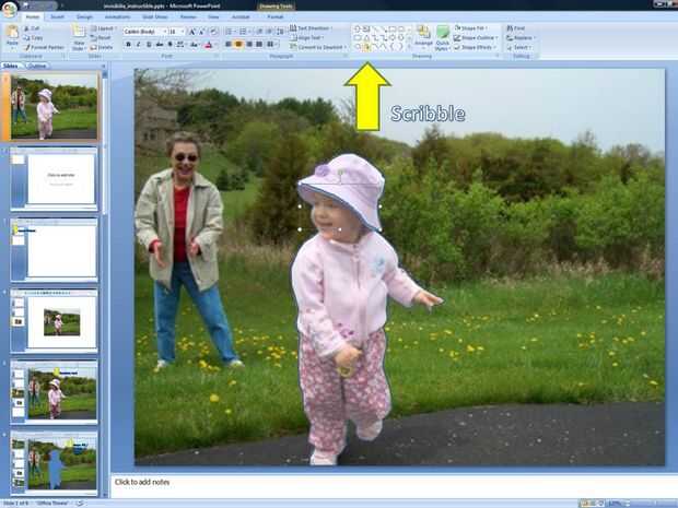 En PowerPoint2007, pueden encontrar la herramienta de garabato en la misma barra de herramientas y menú donde encontraras la herramienta forma libre.