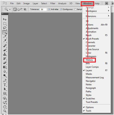 -Esto hará que aparezca un panel muy útil y necesario que todas las acciones que mientras edición mostrará. Ver imagen 2. Si usted comete un error durante la edición, este panel puede utilizarse para volver a una mayor acción simplemente haciendo clic en una acción que hiciste en el pasado. Nota que "Control + Z" juntos volverá de nuevo solo paso así. Esto puede ser una forma rápida de volver atrás un paso y seguir trabajando.