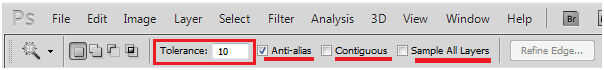 -La flecha de cursor debe cambiarse ahora en algo que parece una pequeña varita. Usted también encontrará que en la parte superior de la pantalla, propiedades han aparecido que tratan directamente con la "herramienta varita mágica" como "Tolerancia," "Contiguo", "Suavizado" y "Muestra todas las capas". Sólo a discutir lo que la "tolerancia" opción hace.