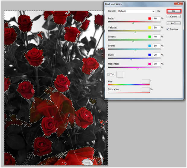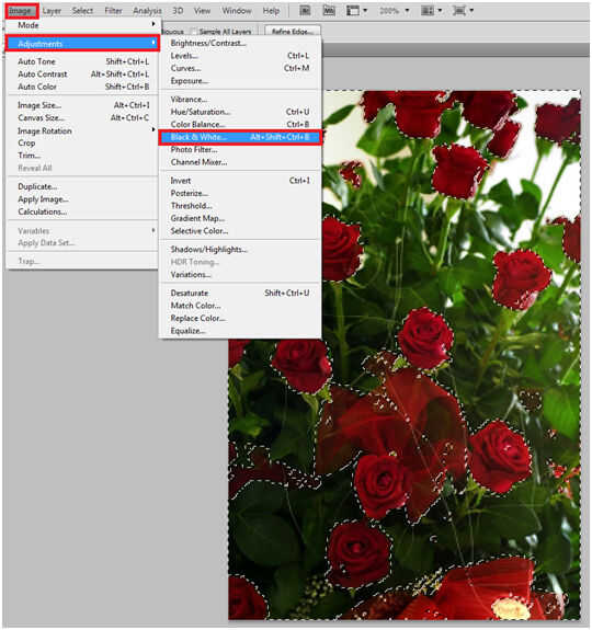 -7-B. Ahora con todas las hojas verdes y tallos seleccionados, ir hasta la parte superior de la pantalla y haga clic en "Imagen". Bajar a "Ajustes"--> clic en "Black & White". Esto trae un menú, sólo seguir adelante y haga clic en "OK."