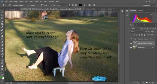 Después de que haya hecho su selección, haga clic en "perfeccionar borde" en la barra superior. Ir al menú desplegable y seleccione 'Nuevo documento'. Su imagen ahora se separará del fondo y se abrirá en un nuevo documento. Esta es una de mis herramientas más usadas. Lo uso en casi todas mis ediciones, porque me gusta crear efectos de fantasía, y el fondo de mis fotos normales no casi bastante cercano a lo que preveo.