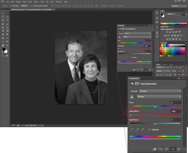 El tono / saturación cuadro de diálogo aparecerá. Reducir la saturación a -100 deslizando la flecha hacia la izquierda.