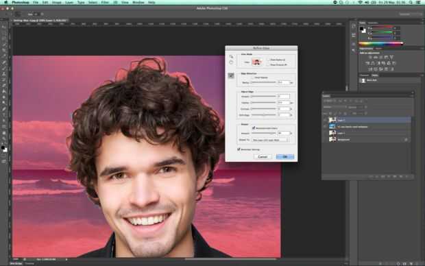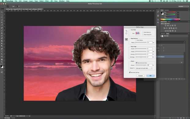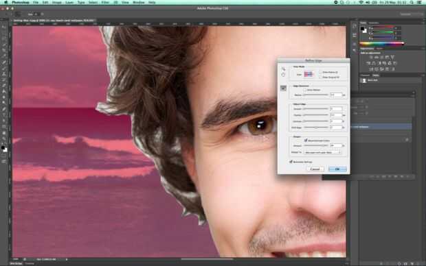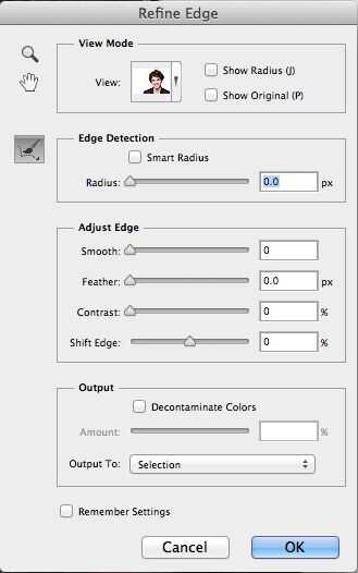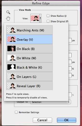 3. en el menú de refinar borde, seleccione overlay en el modo de vista, esto nos dará un fondo de opacitated roja sobre nuestro tema. en la sección de salida, en descontaminar colores y establece en 80 y salida a la nueva capa con máscara de capa.