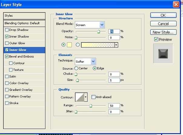 Haga doble clic en el resplandor interior y jugar con la configuración. Usé: modo de mezcla = pantalla, opacidad = 75, tamaño = 5px (que es aproximadamente el valor por defecto)