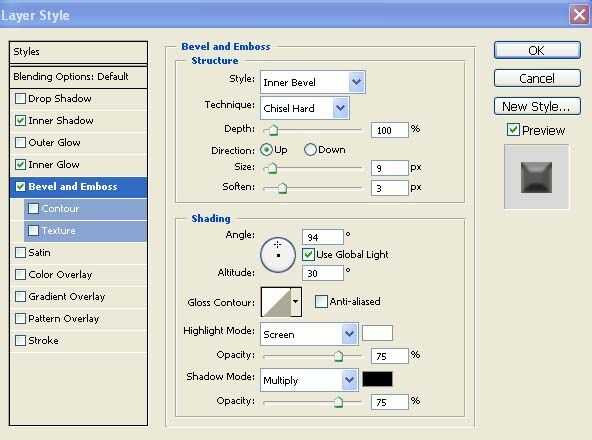 Haga doble clic en bisel y relieve. Usé: estilo = bisel interior, técnica = cincel duro, tamaño = 9px, suavizar = 3px y destacar y conjunto de modos de pantalla de 75% de sombra multiplicar.