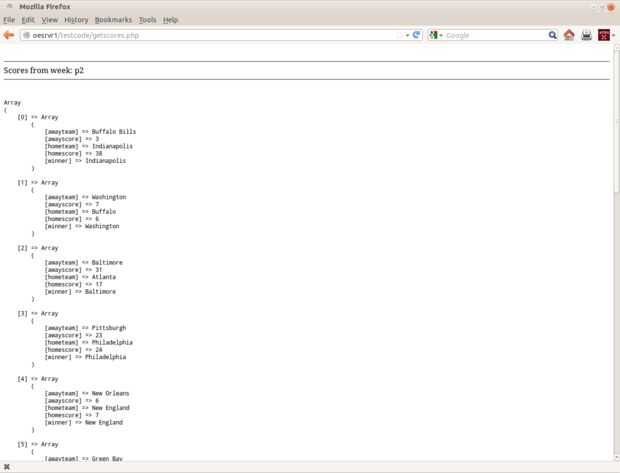 por ejemplo, $scores [0] ['awayteam'] contiene el nombre del equipo (parte ['awayteam']) desde el primer juego en la página (parte [0])