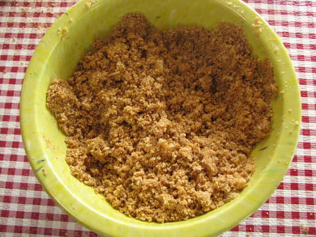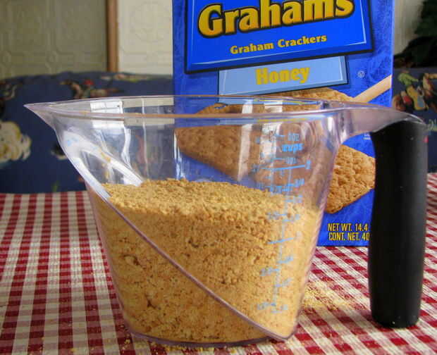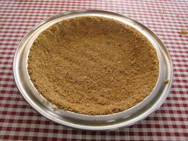 Mezcle las migas de galletas graham, avellanas, azúcar morena y mantequilla derretida en un tazón y mezcla bien. Colocar la mezcla de la miga en una tartera de 9" y acaricia suavemente en la parte inferior y los lados de la cacerola. Cepille las migas sueltas (éstos pueden quemar durante el horneado).
