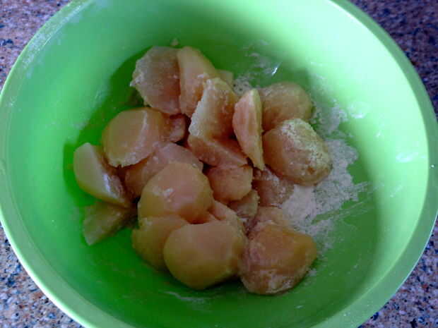 No se olvide de dados encima de las manzanas lo suficientemente pequeñas como para que encajen en los tarros pequeños. Las manzanas se cocinan abajo en el horno por lo que realmente hay que embalarlas apretado. Mezclar todos los ingredientes y reservar.