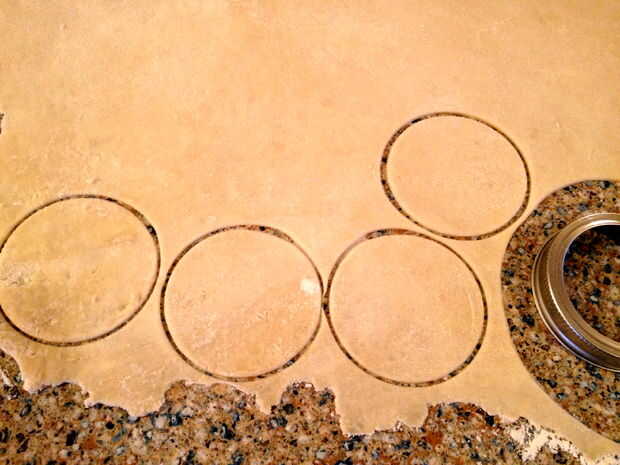 2. Usando la tapa de la jarra como una herramienta de corte, perfore dos veces tantos círculos como planea hacer empanadas (uno para la parte inferior. y uno para la parte superior